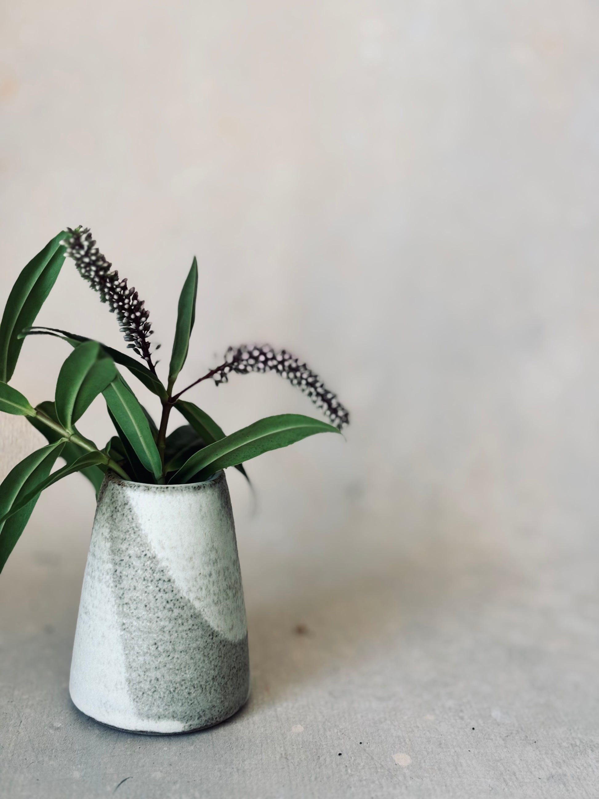 A grey stoneware bud vase with twisted, layered white matte glaze. The freestyle glazing means this little piece is stunning from every angle.