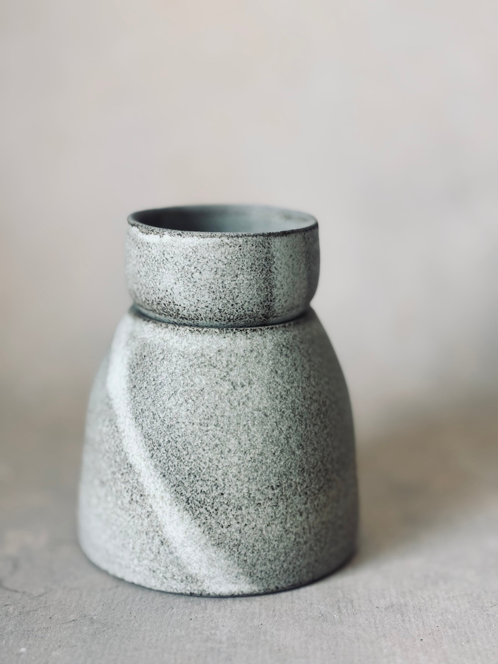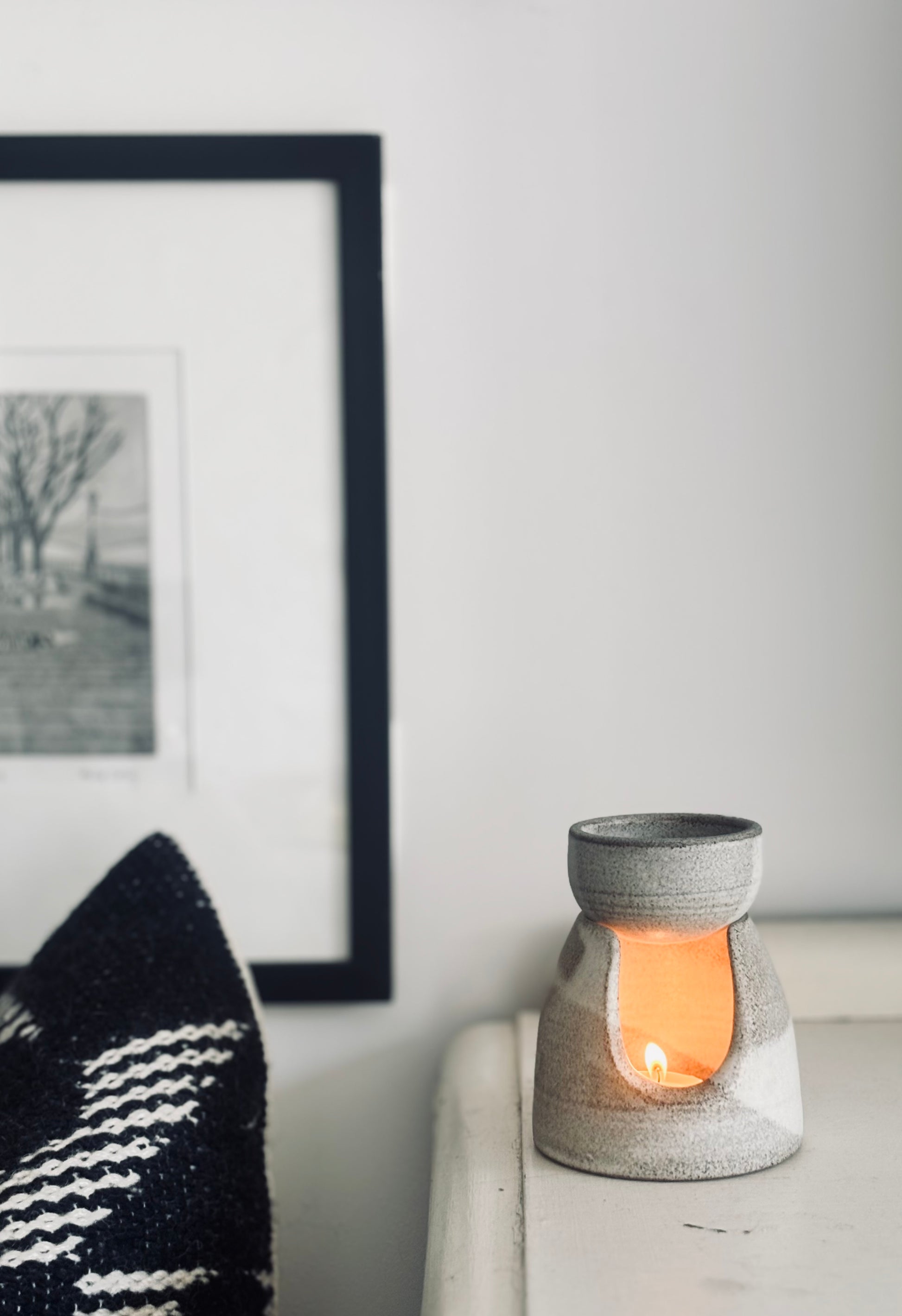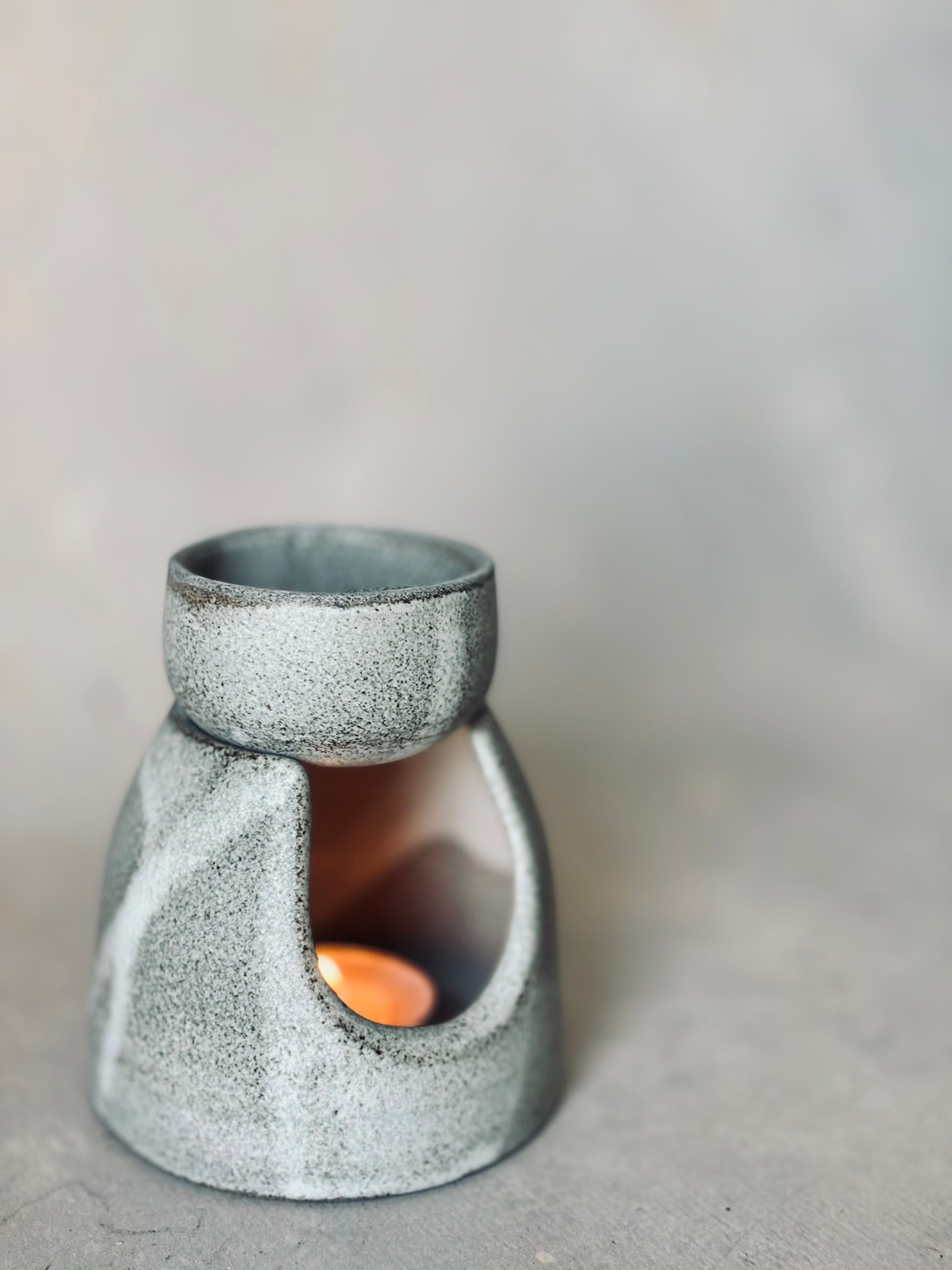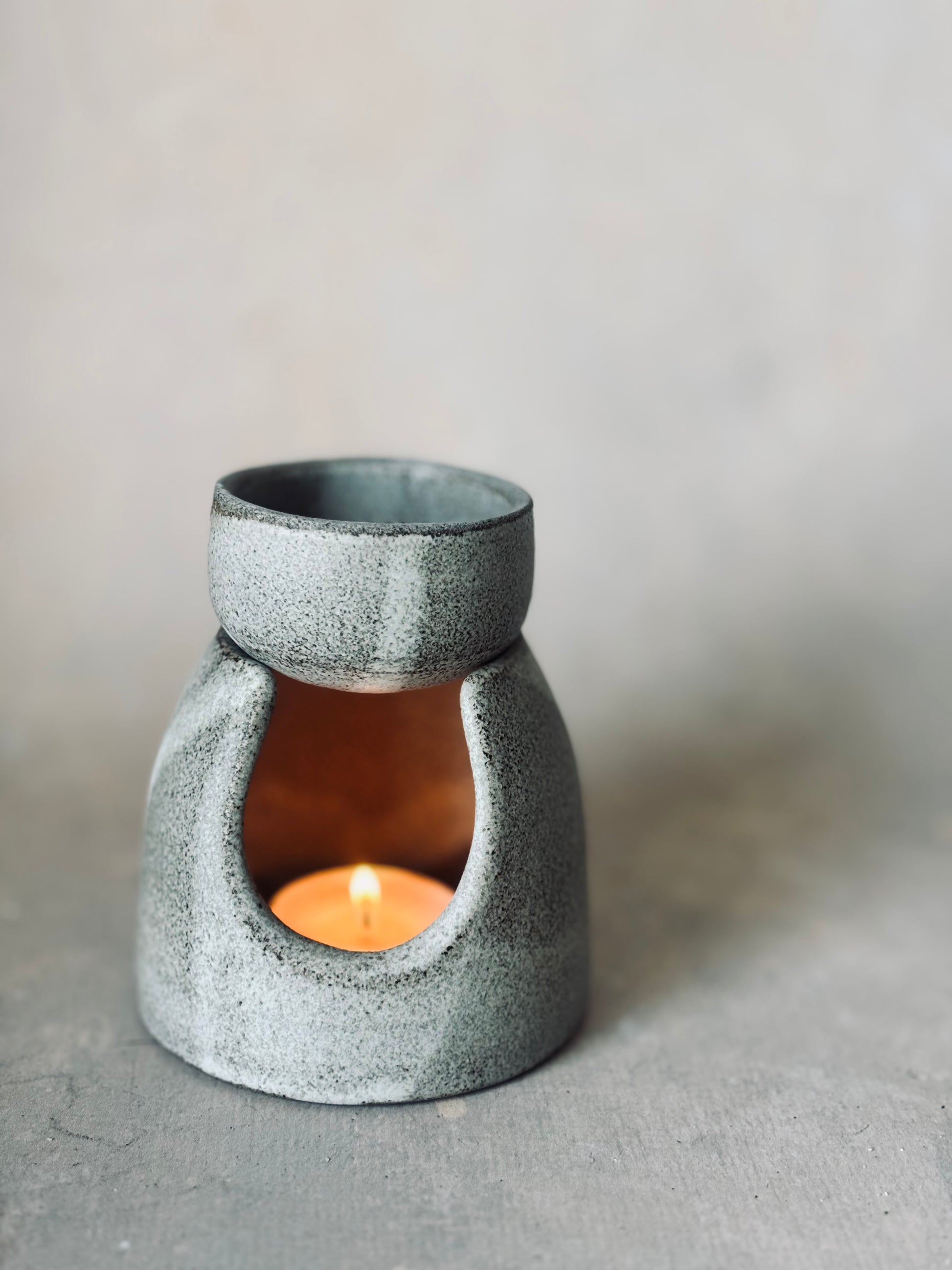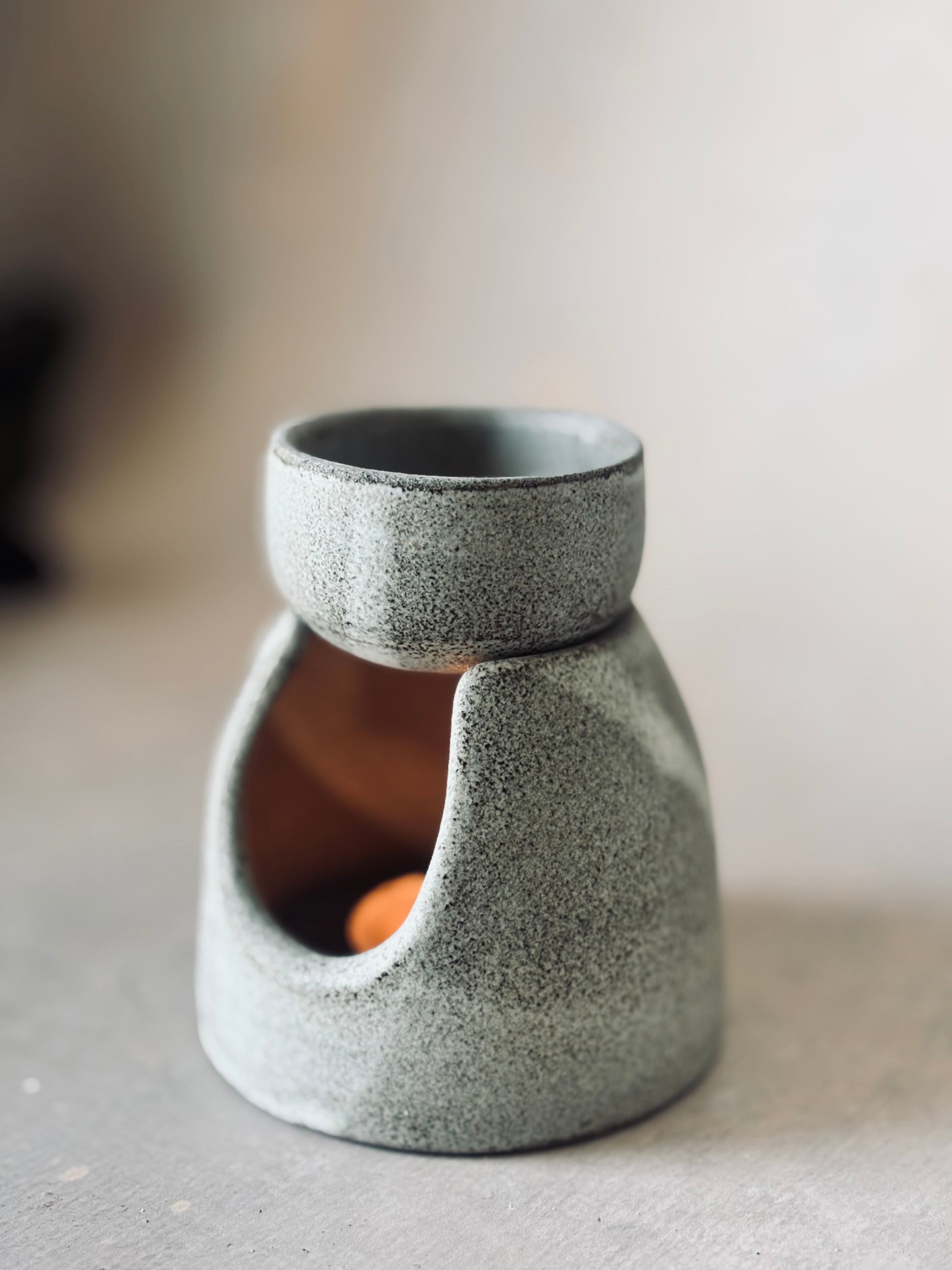 Grey stoneware burner for oils or wax melts. Removable bowl.