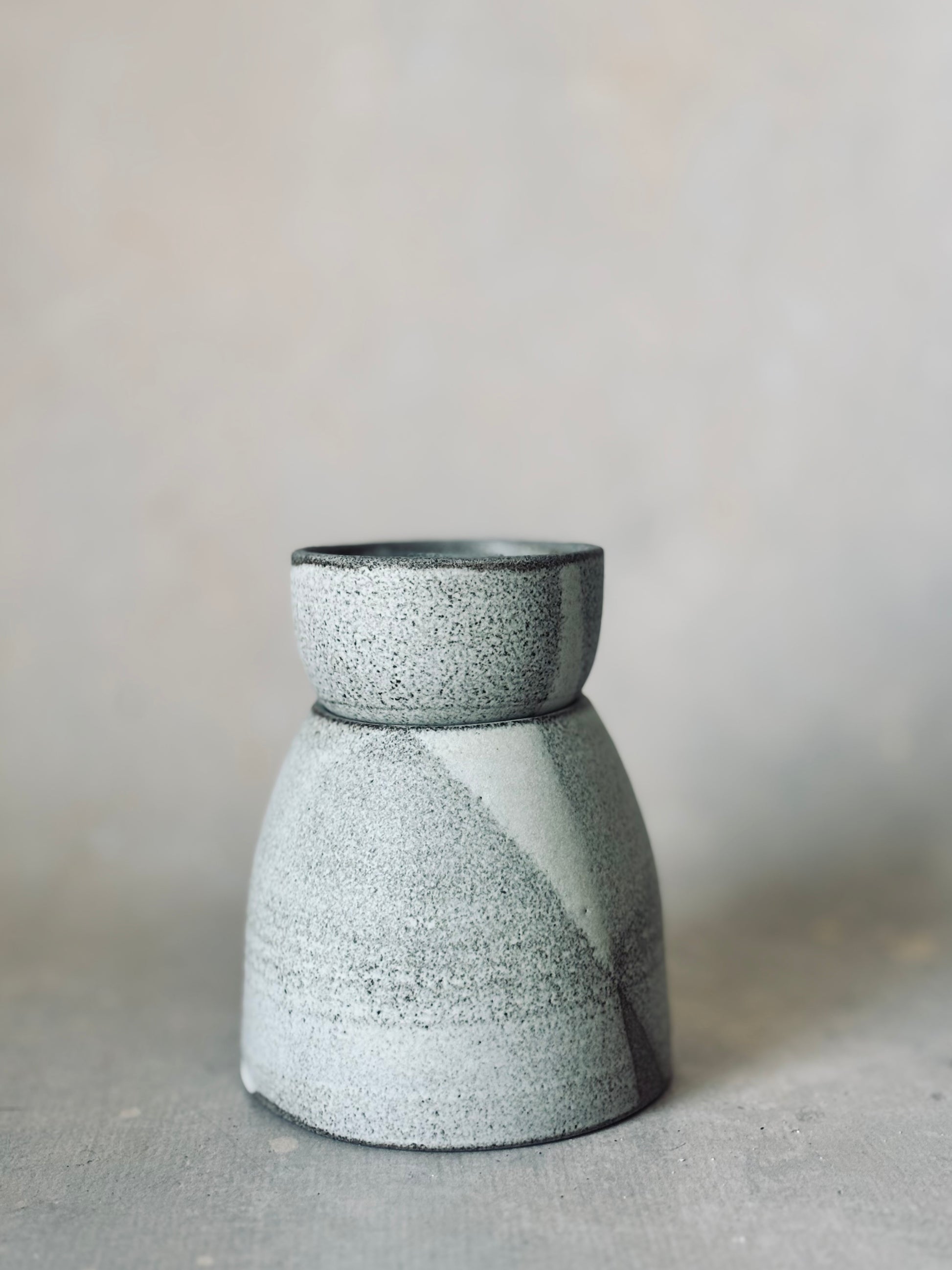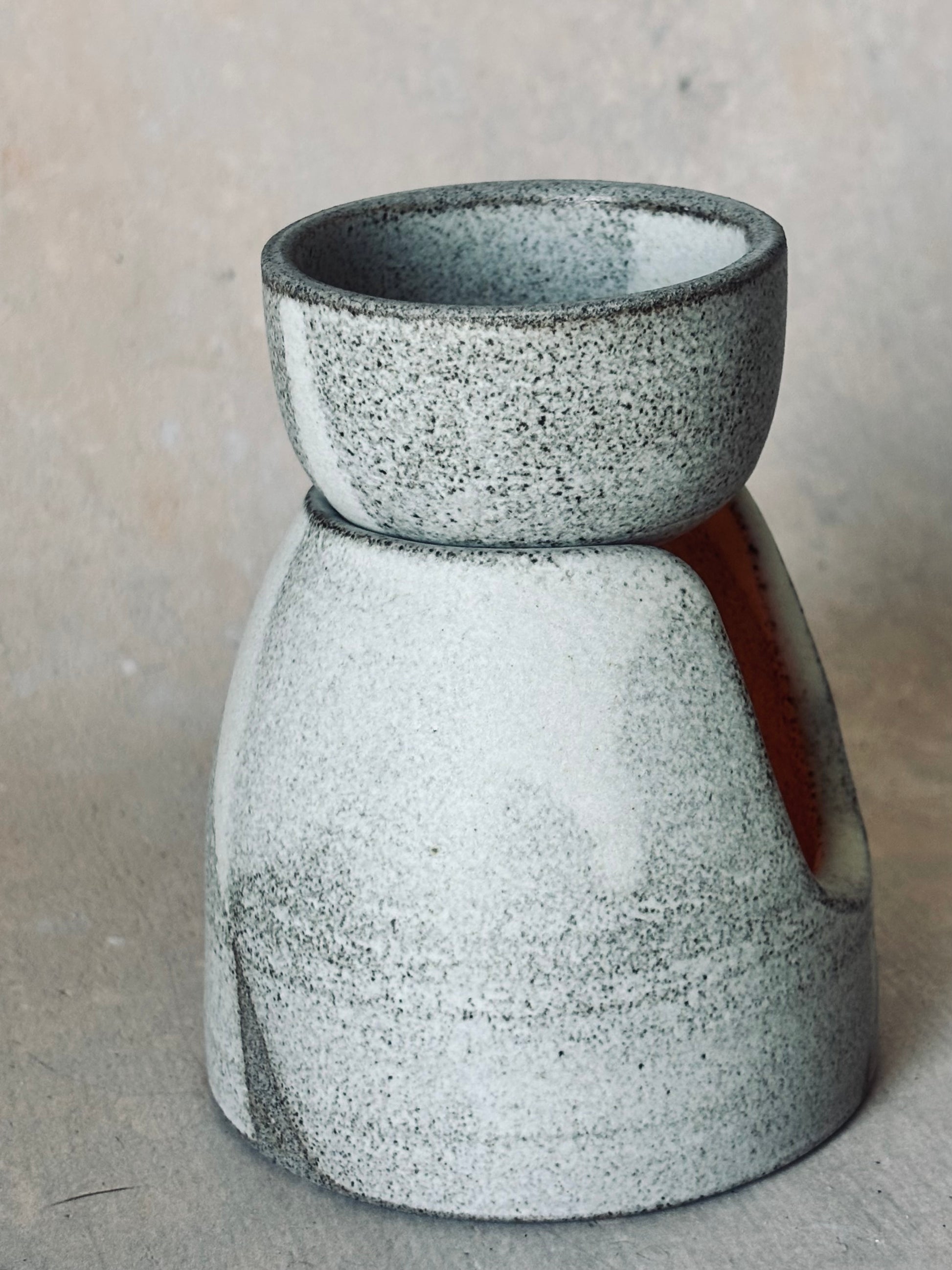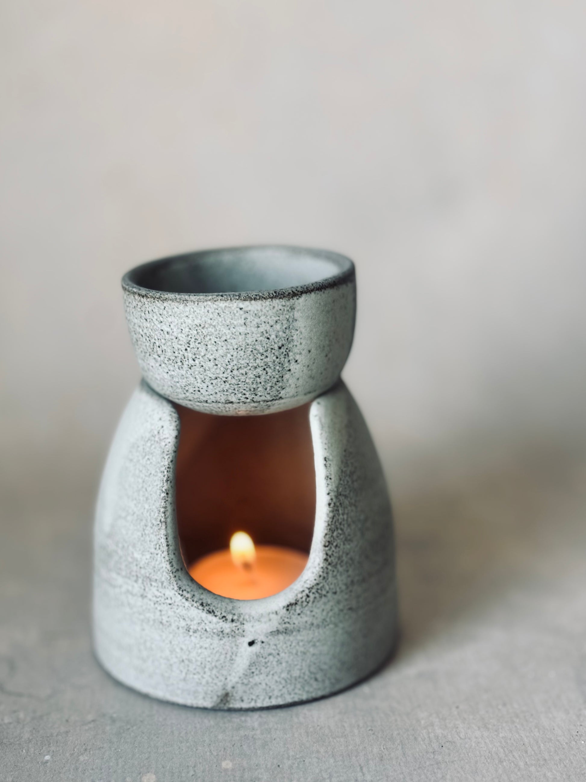 Grey stoneware burner for oils or wax melts. Removable bowl.