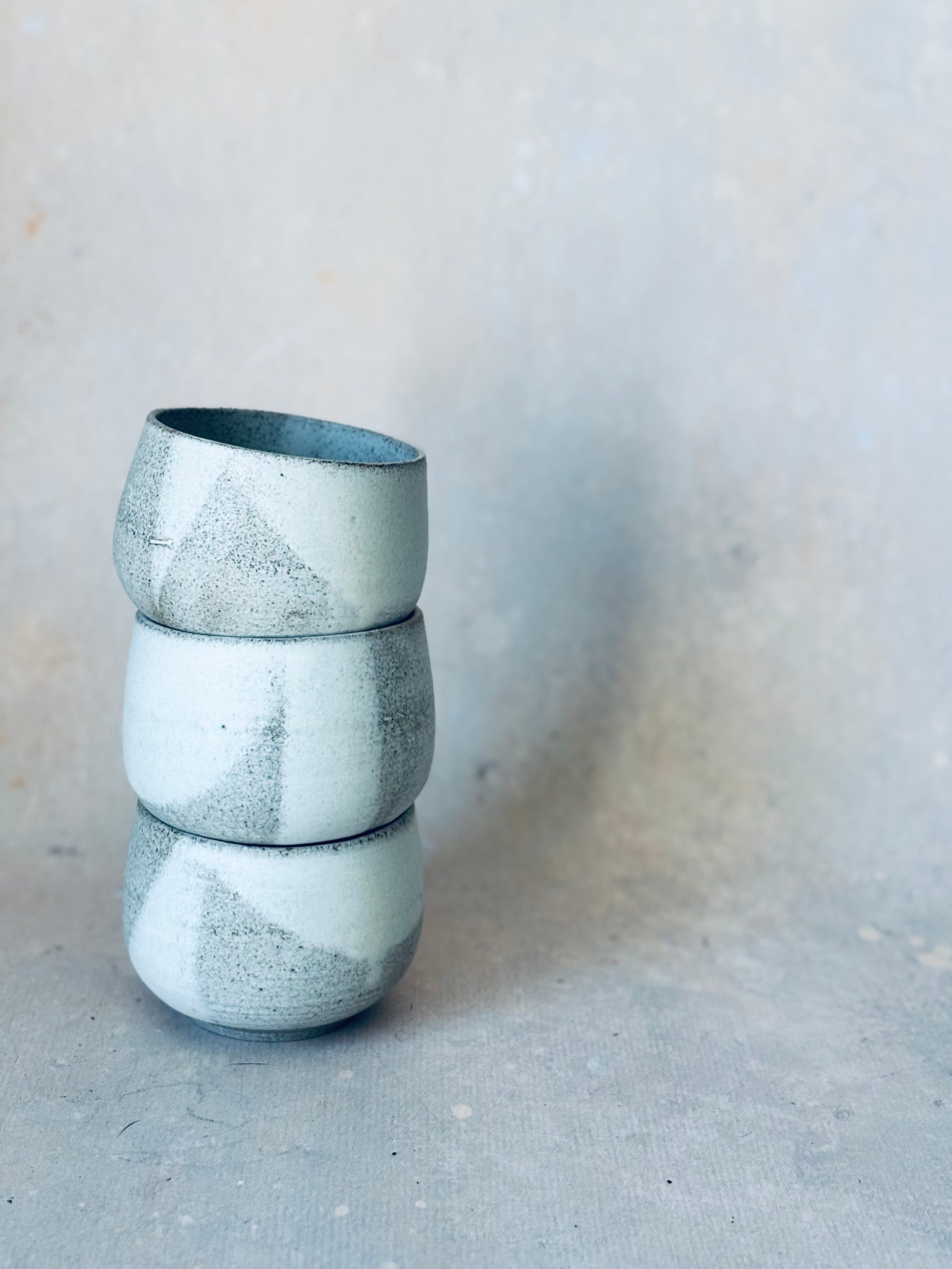 The ultimate flat white cup. Handle-less with a rounded bottom, perfect for cupping in your hand. These grey stoneware cups have been glazed in layered white, creating unique patterns and shapes in each one. No two are ever the same. As such, please expect variations if ordering more than one. This is intentional and adds to their charm.