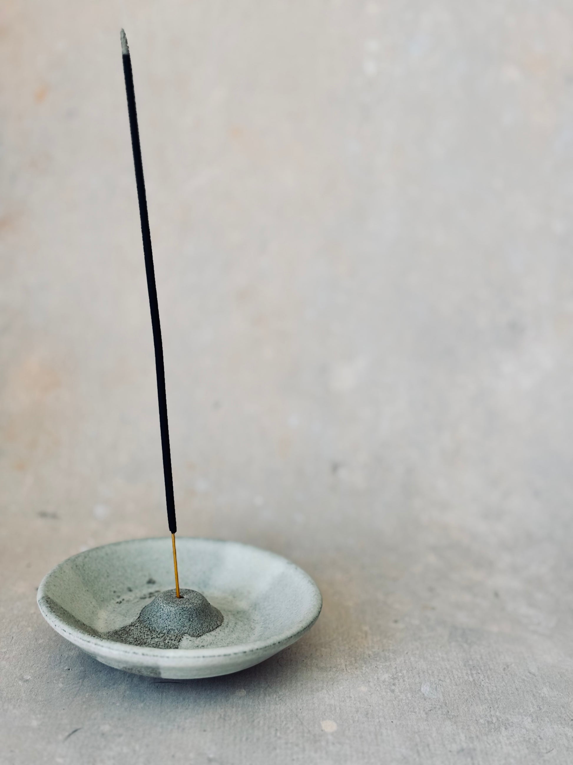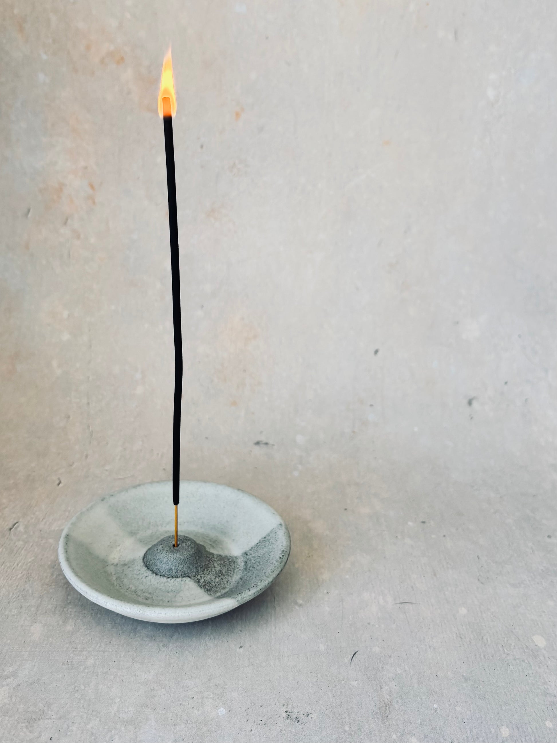 Incense holder in grey stoneware, finished with a matte white layered glaze. Crafted from a single piece of clay.