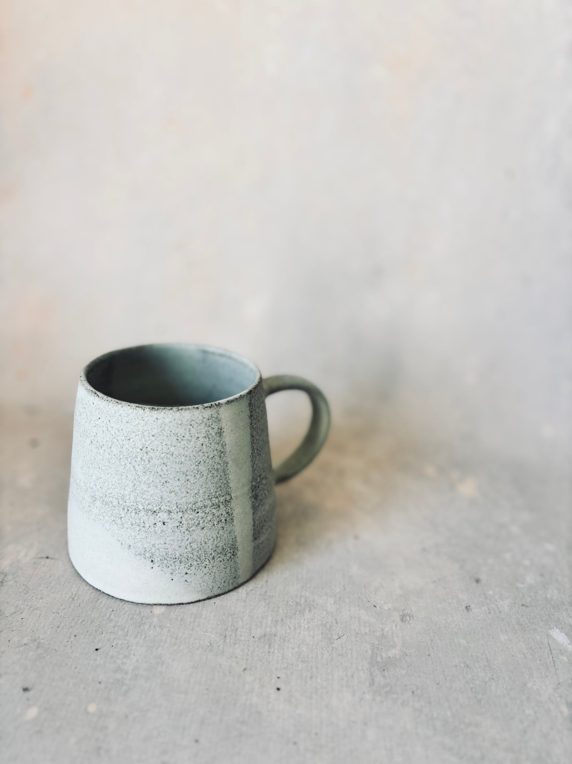 Grey stoneware mug. Glazed in patterns and layers of tactile satin matte white. No two are the same, but perfectly compliment each other. Just the right size for a cup of tea.