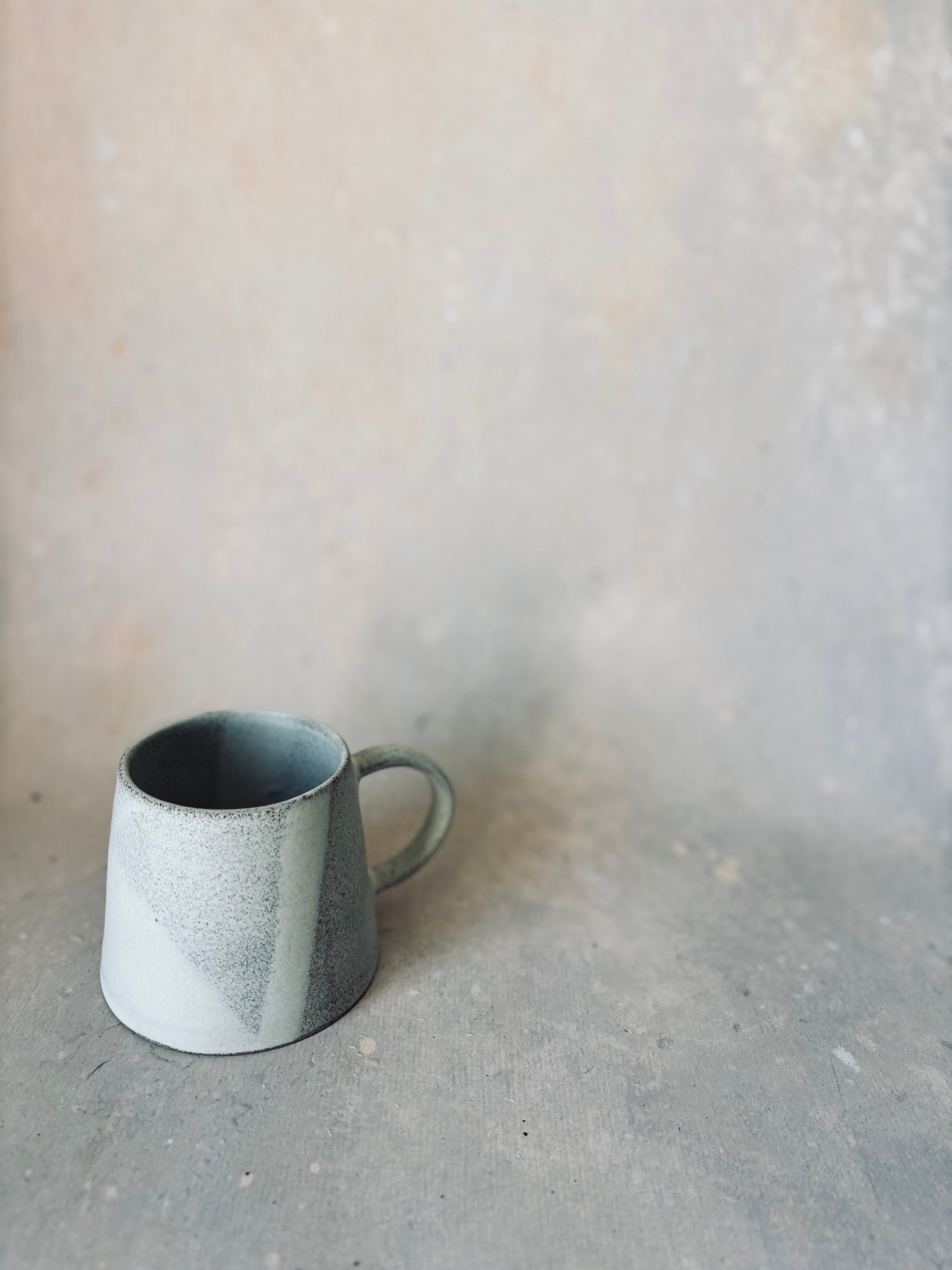 Grey stoneware mug. Glazed in patterns and layers of tactile satin matte white. No two are the same, but perfectly compliment each other. Just the right size for a cup of tea.