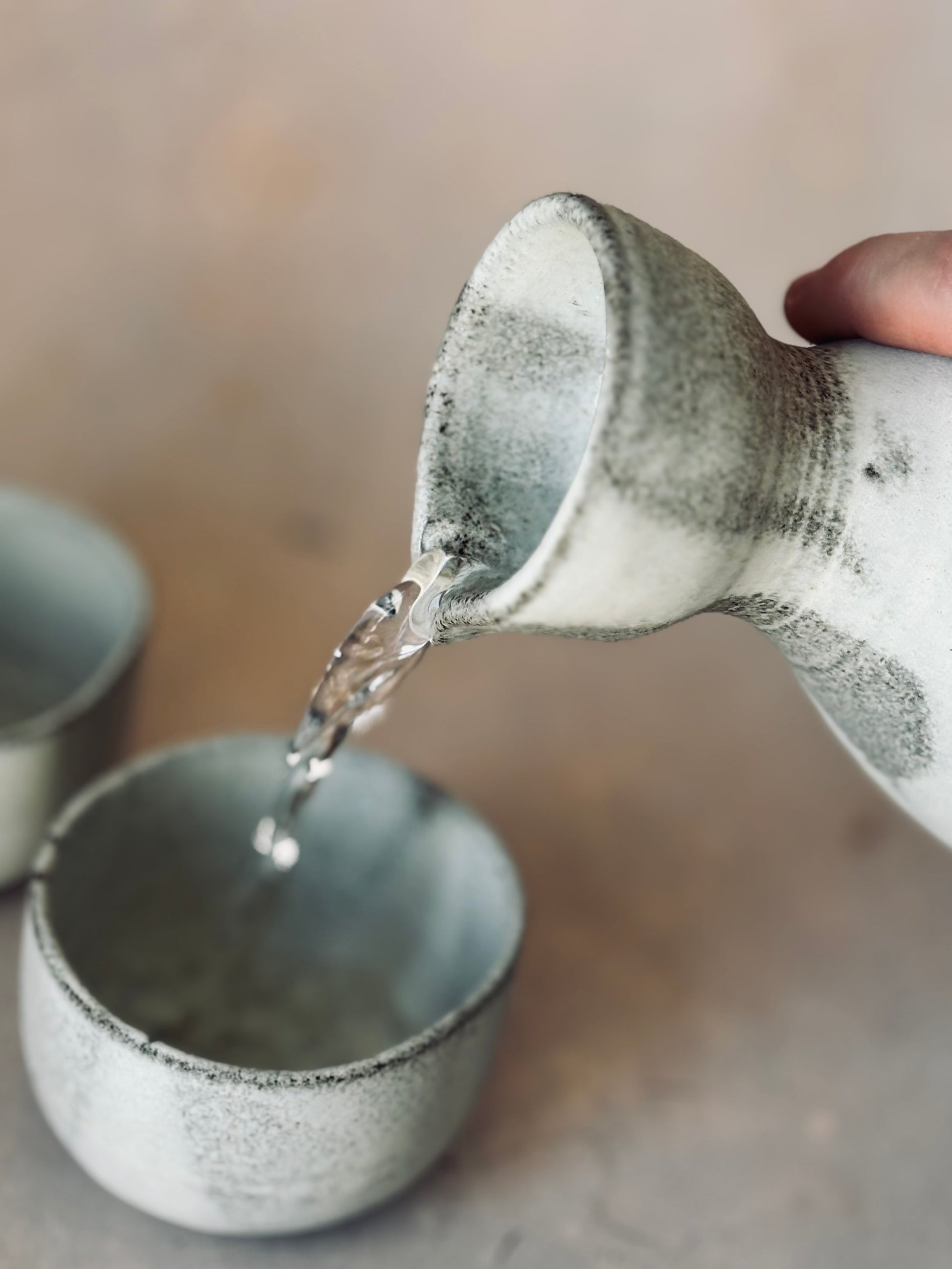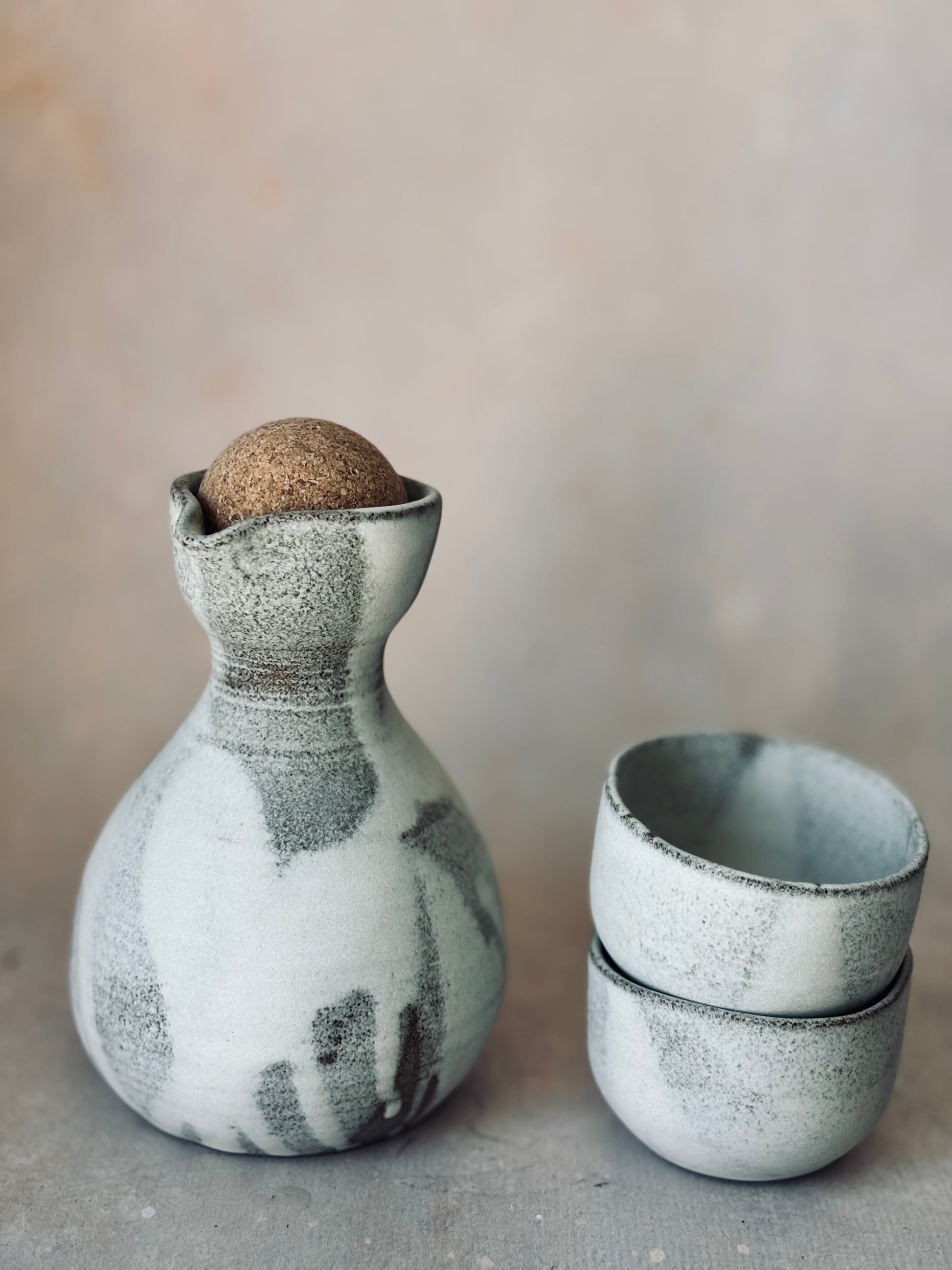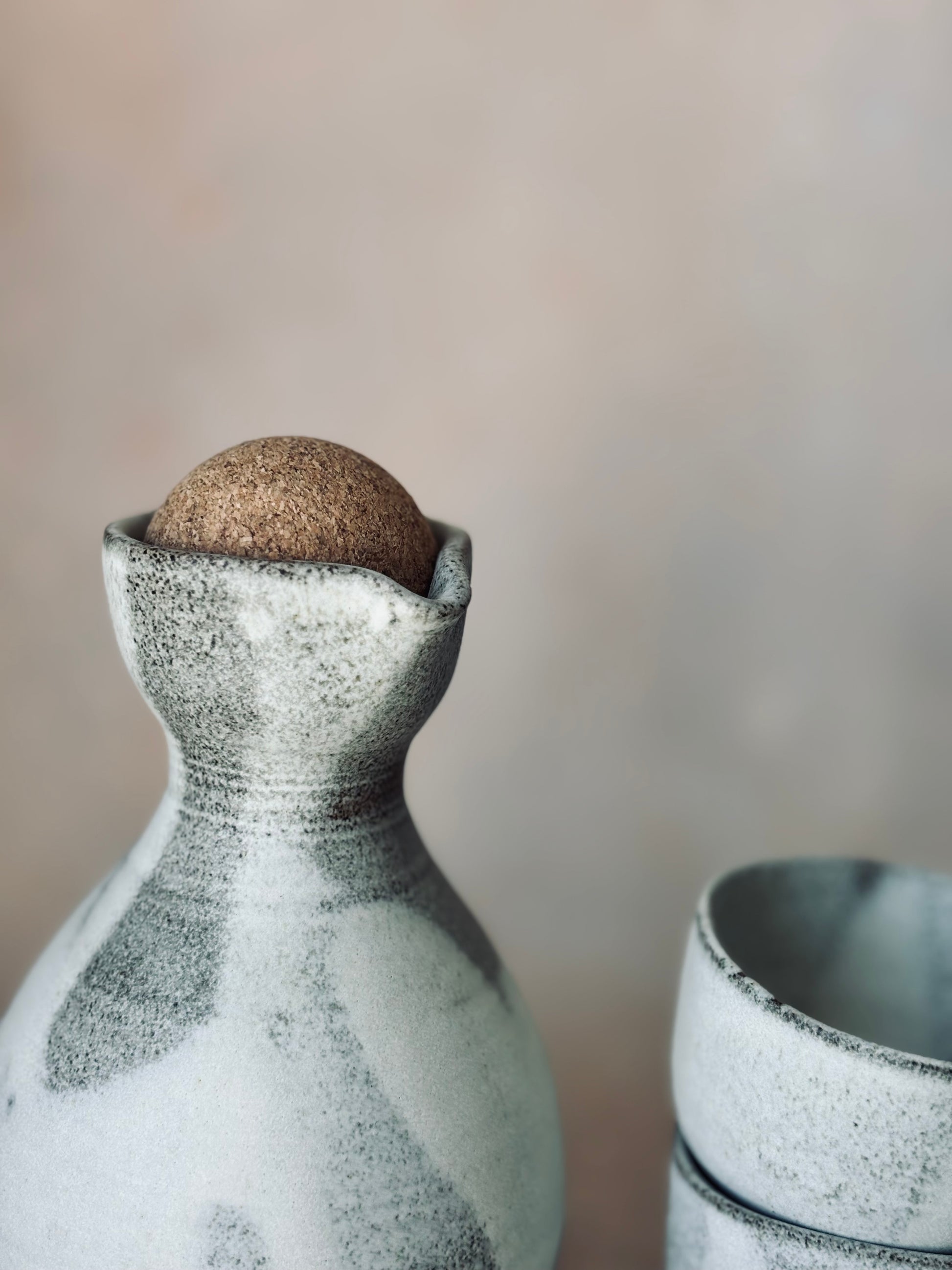 A round bellied bottle, with spherical cork stopper. The cups have been softly squared off after throwing. Grey stoneware, finished with a tactile white matte glaze in layered, poured patterns. Totally unique, impossible to replicate.