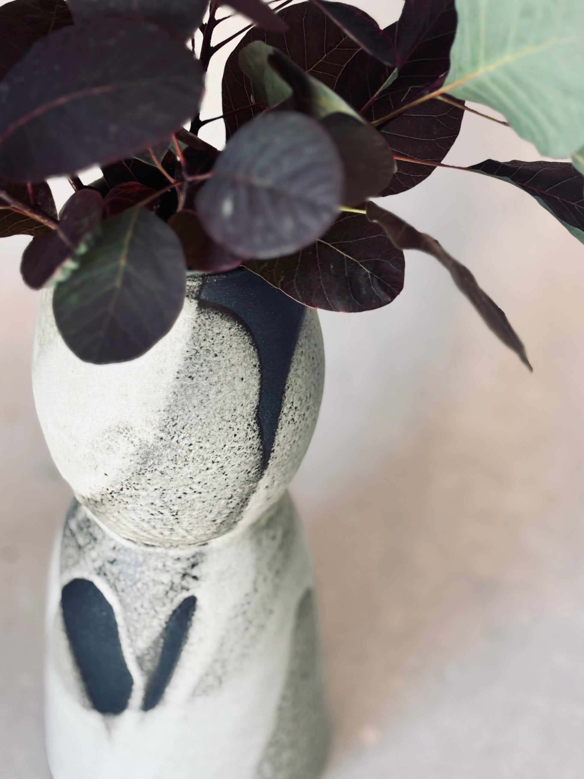 Sculptural vase in black stoneware. This is an experimental piece, completely unique in the collection. Thrown in two pieces, the white matte glaze has been allowed to travel its own path and do its own thing, resulting in a bold, direct centrepiece. Perfect for long stems or foliage.