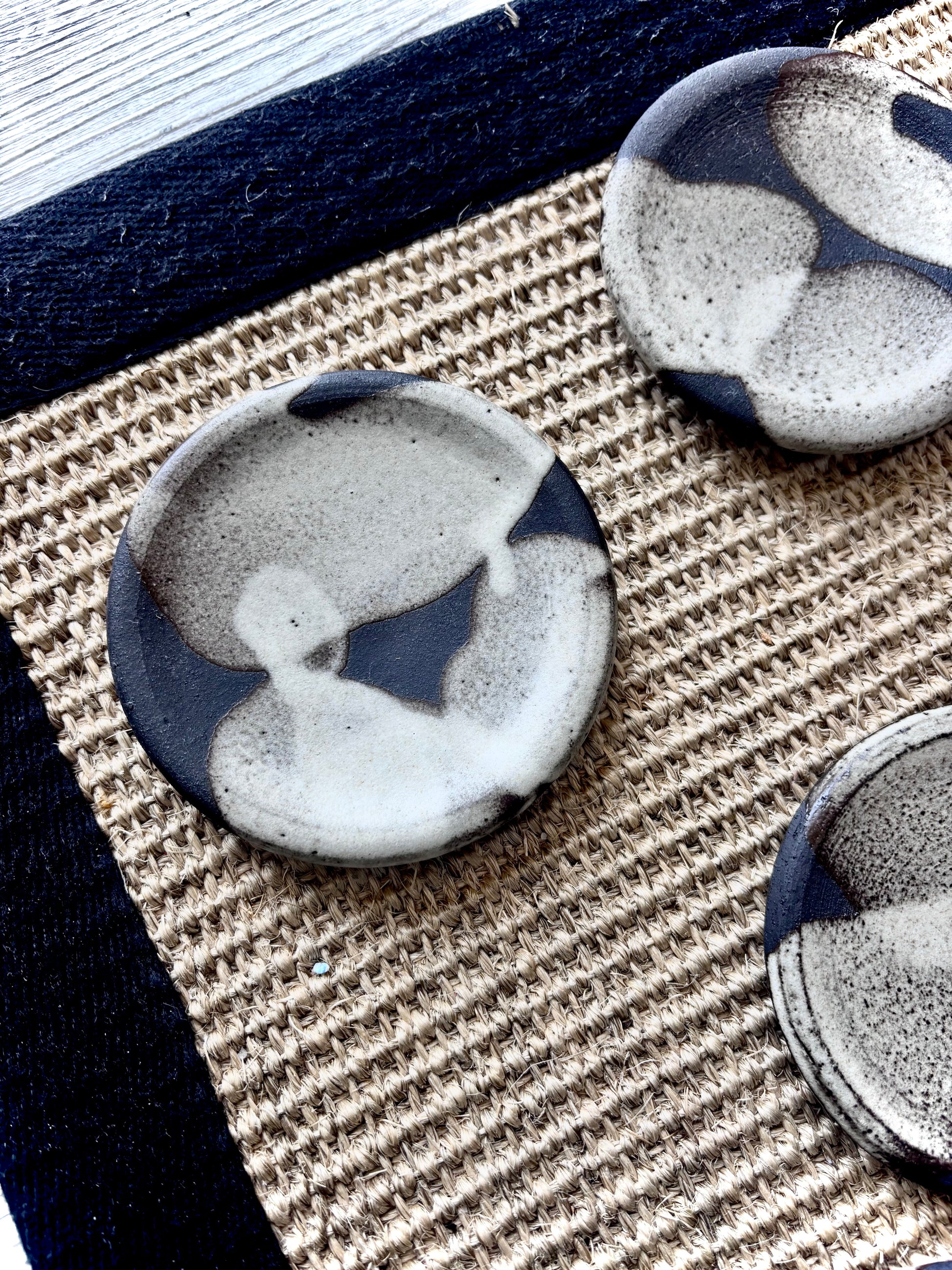 A simple trinket dish in black stoneware clay, finished with contrasting matte white glaze. Each dish is entirely unique, the glaze layering technique cresting an organic free-styled result. No two will ever be the same so pick your favourite!