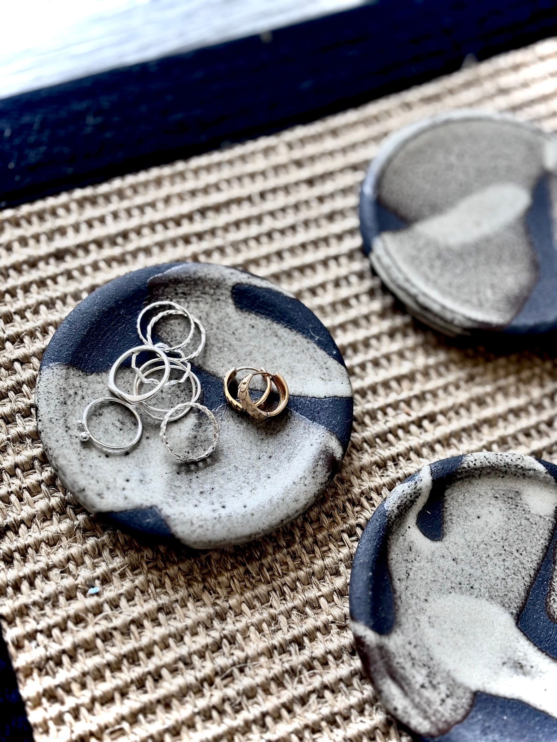 A simple trinket dish in black stoneware clay, finished with contrasting matte white glaze. Each dish is entirely unique, the glaze layering technique cresting an organic free-styled result. No two will ever be the same so pick your favourite!