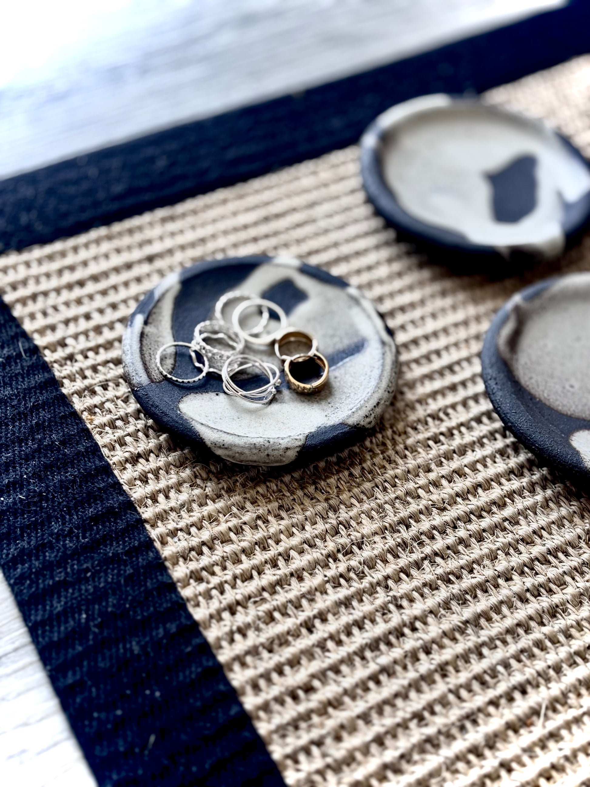 A simple trinket dish in black stoneware clay, finished with contrasting matte white glaze. Each dish is entirely unique, the glaze layering technique cresting an organic free-styled result. No two will ever be the same so pick your favourite!